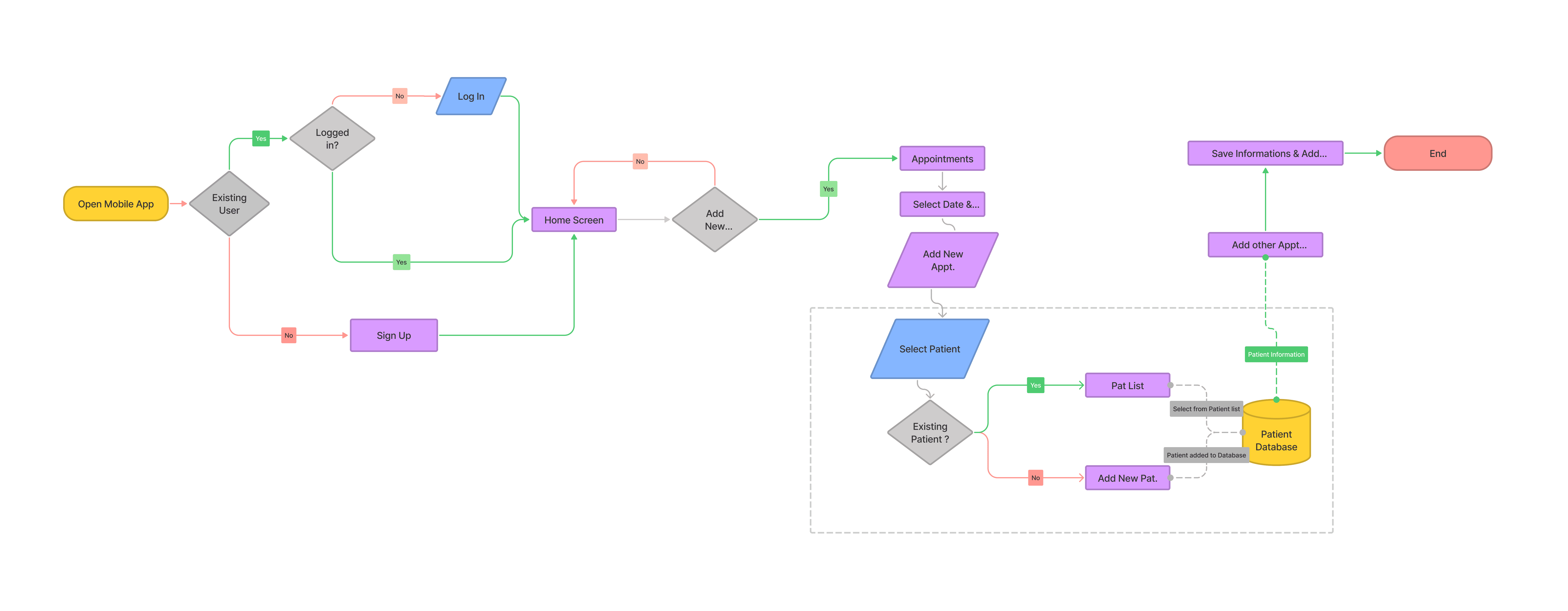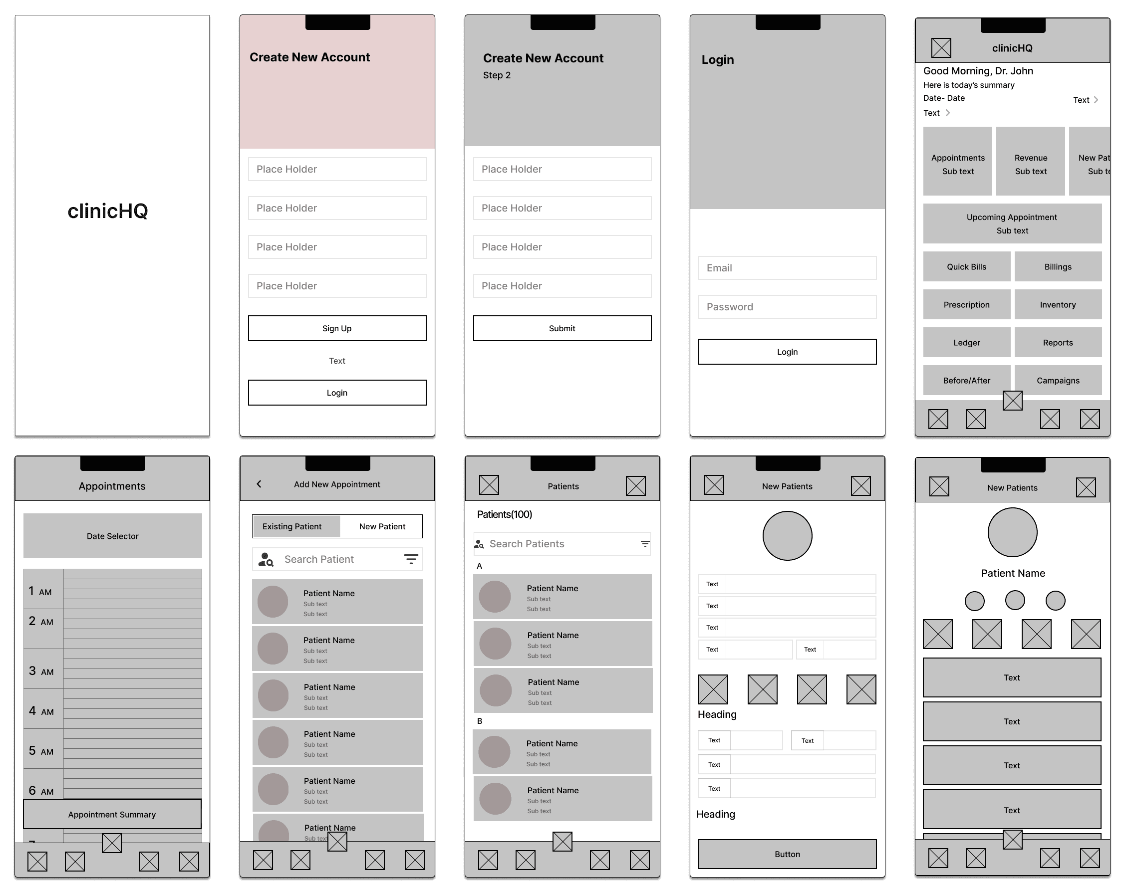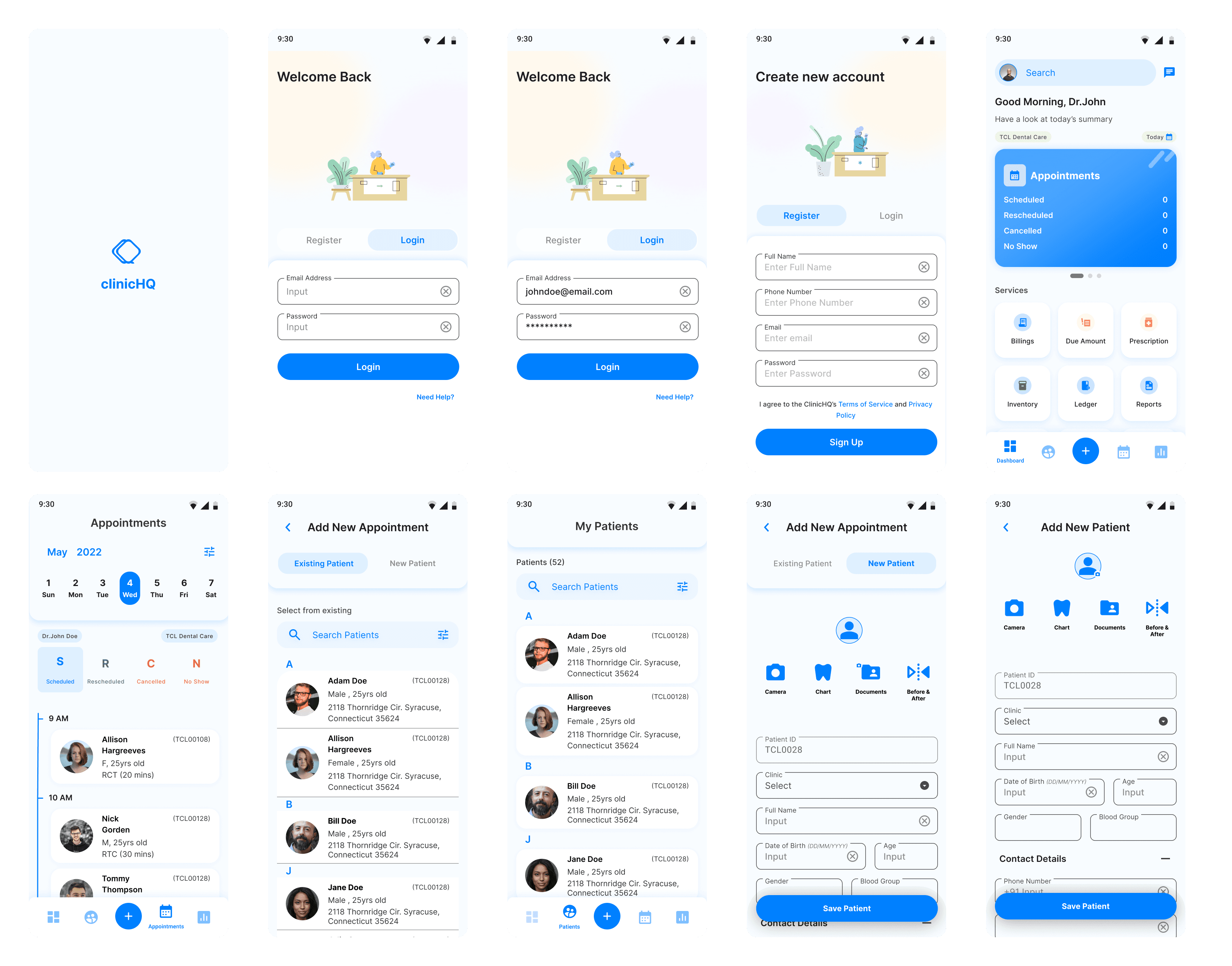 The core flow of the app is depicted here, in which a user creates an account and then navigates to add an appointment for a new patient.